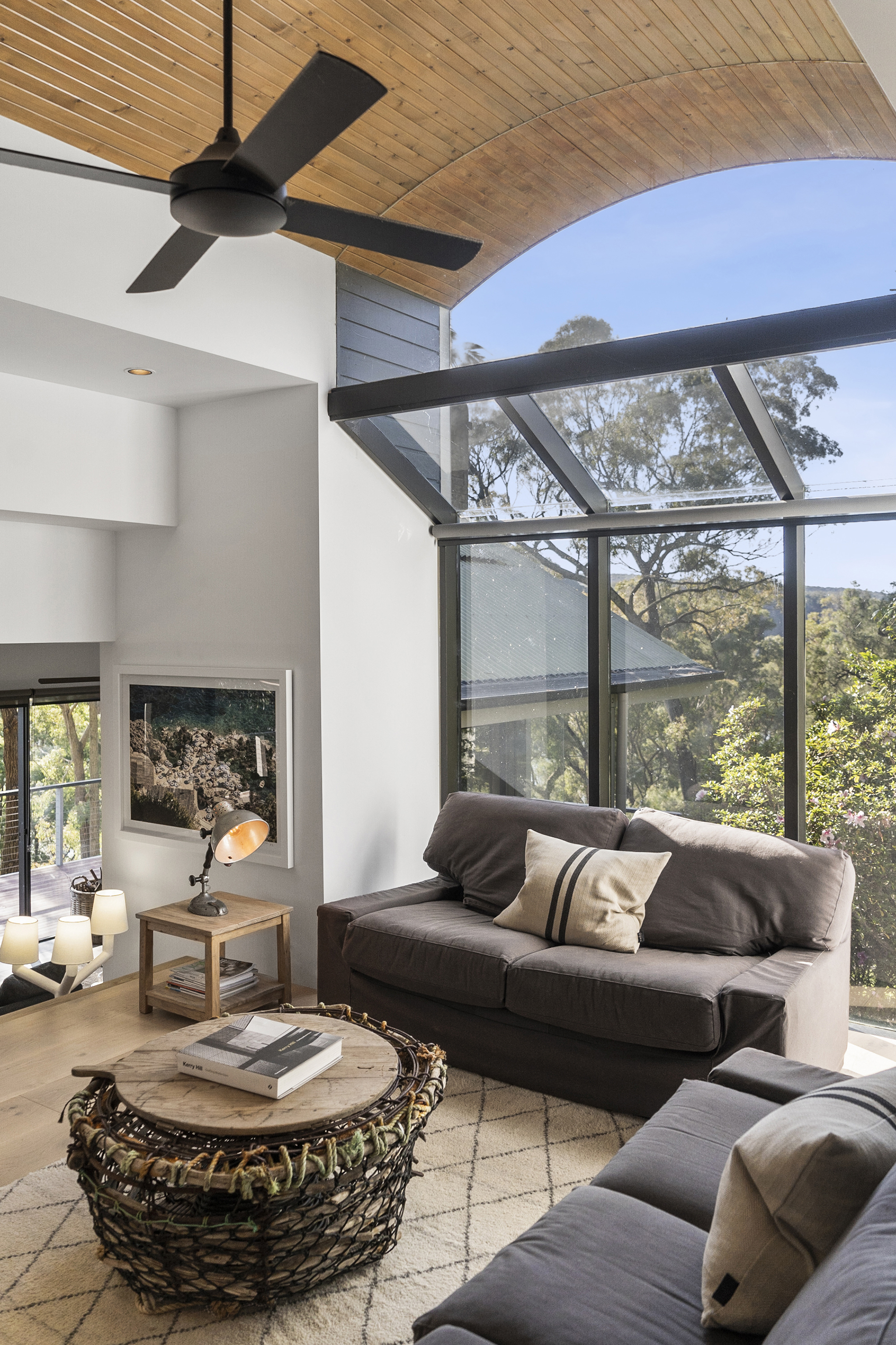 Most recently Ian Traill Architects have totally reimagined the interiors and exterior by adding to the outdoor entertaining areas plus a studio. The striking semicircular roof of the Studio mirrors the curved roof aesthetic of the original house. This offers an additional self-contained flexible living space with its own bathroom and an option of extra storage or sleeping in the Loft.